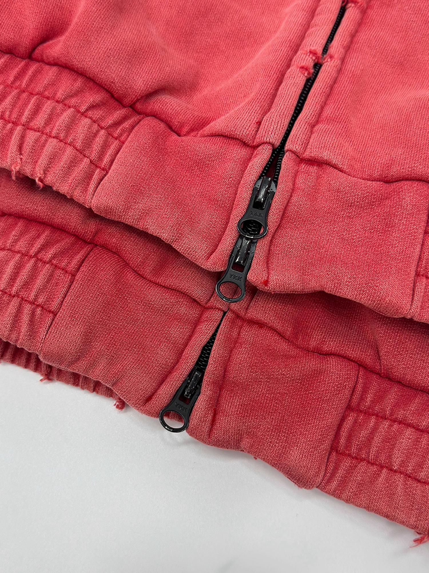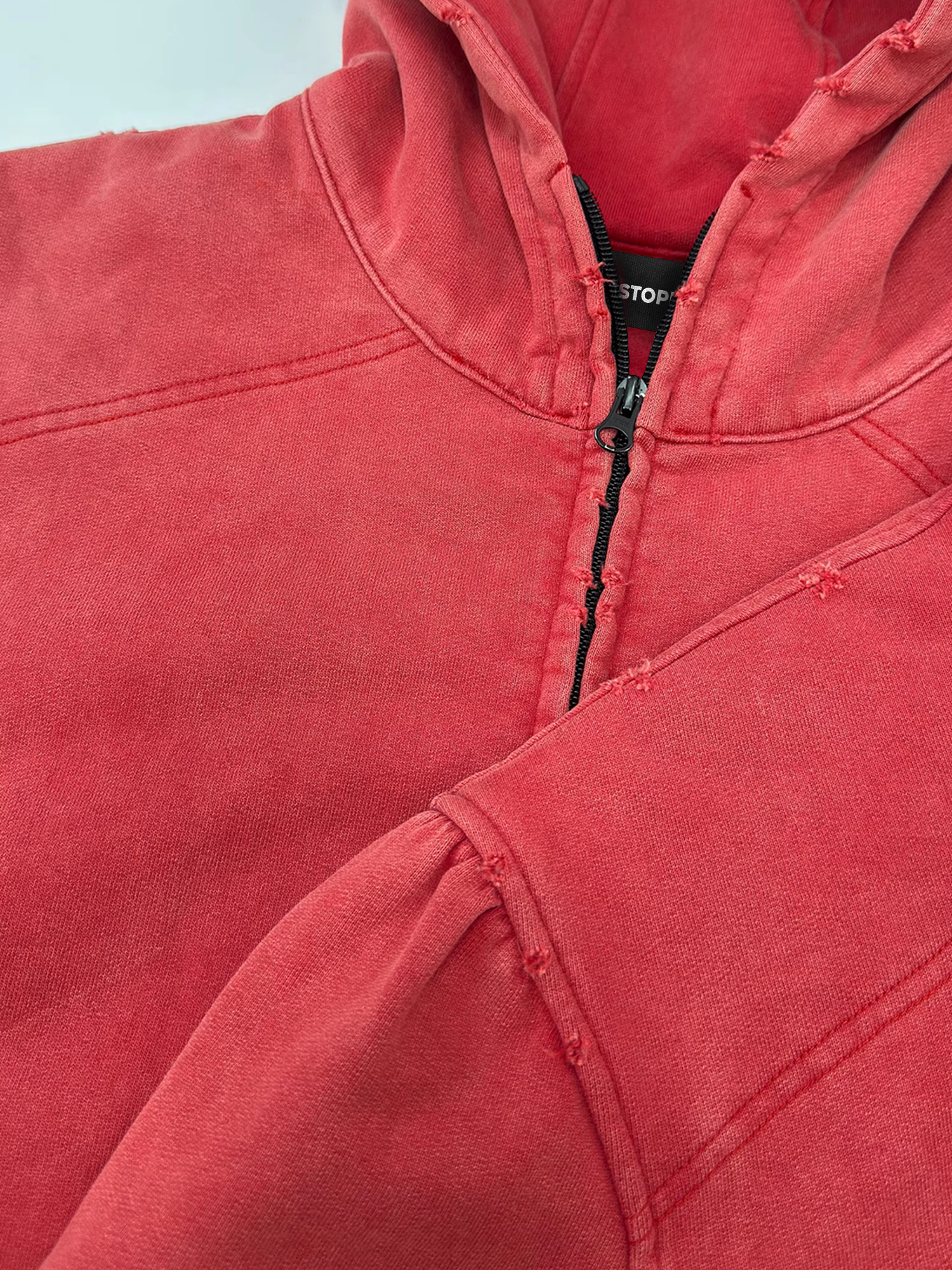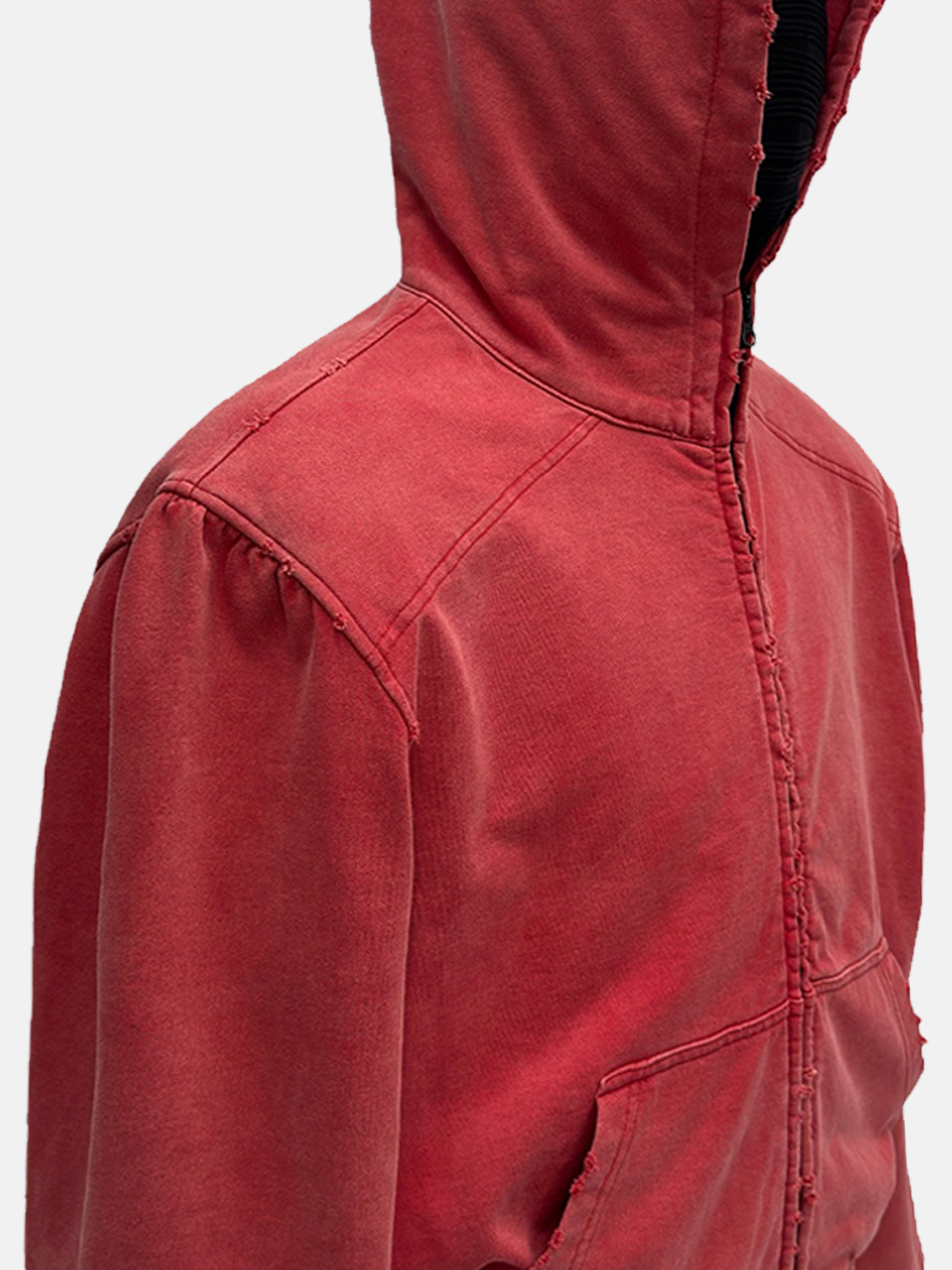 Dieser verwaschene rote Kapuzenpullover mit Reißverschluss versprüht mit seinen Waschtönen und den markanten Nahtdetails einen lässigen Vintage-Charme. Das weiche Material und der elastische Saum sorgen für Komfort und Struktur in deinem Streetwear-Look.