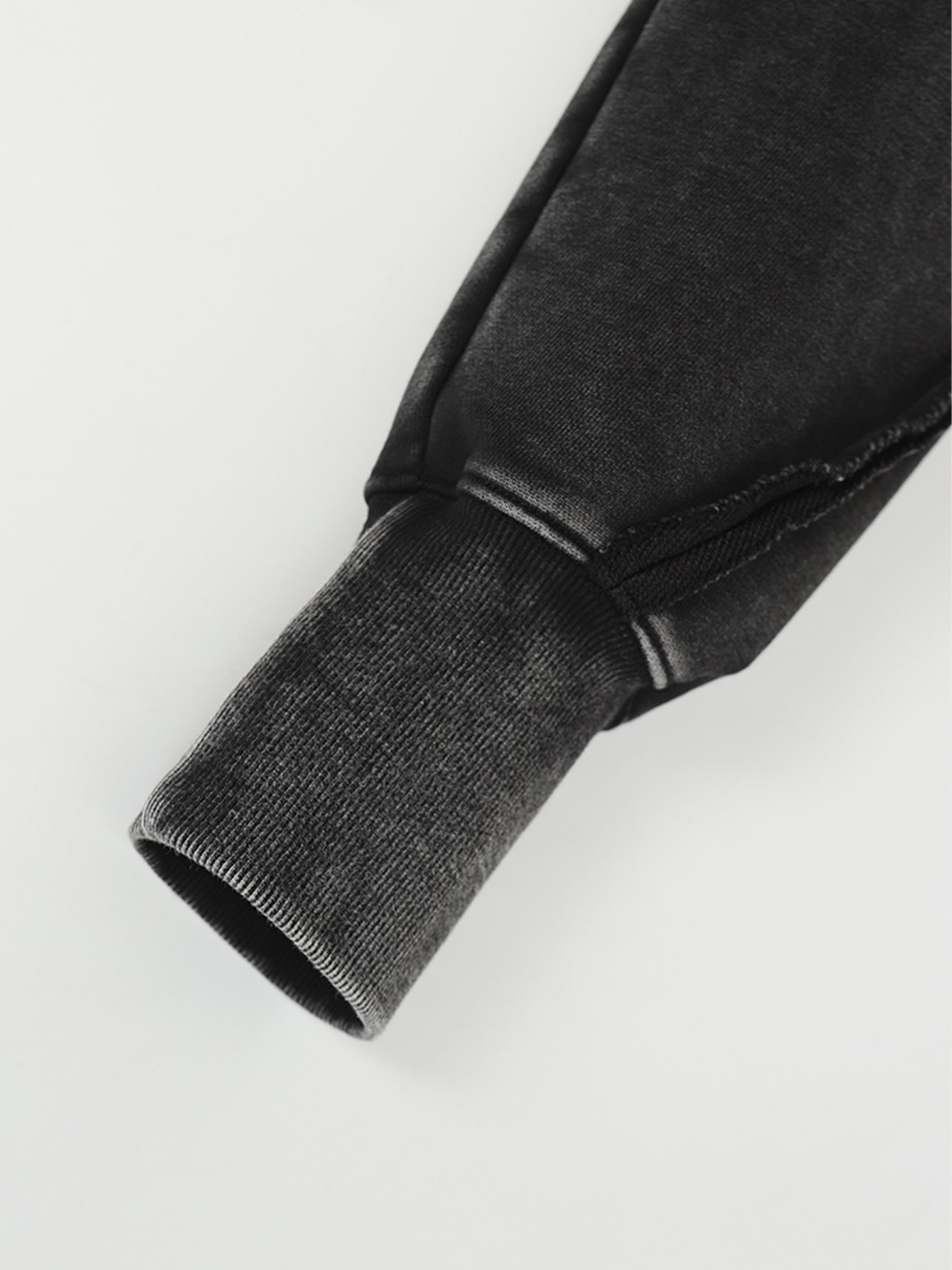 Ein verwaschener schwarzer Hoodie mit diagonalem Frontreißverschluss und Reißverschlusstaschen. Entspannte Form mit sichtbaren Nähten und Rippenbesatz.
