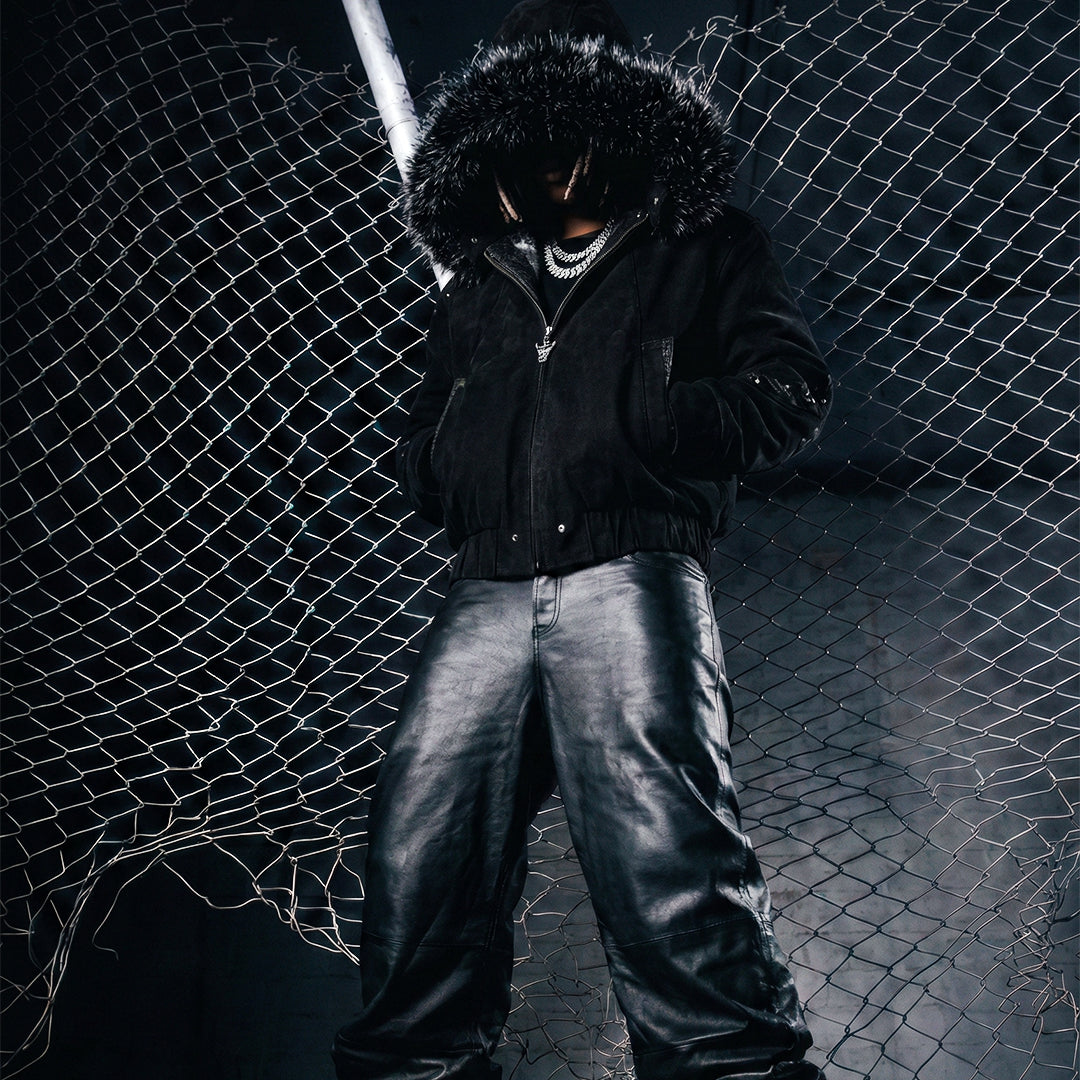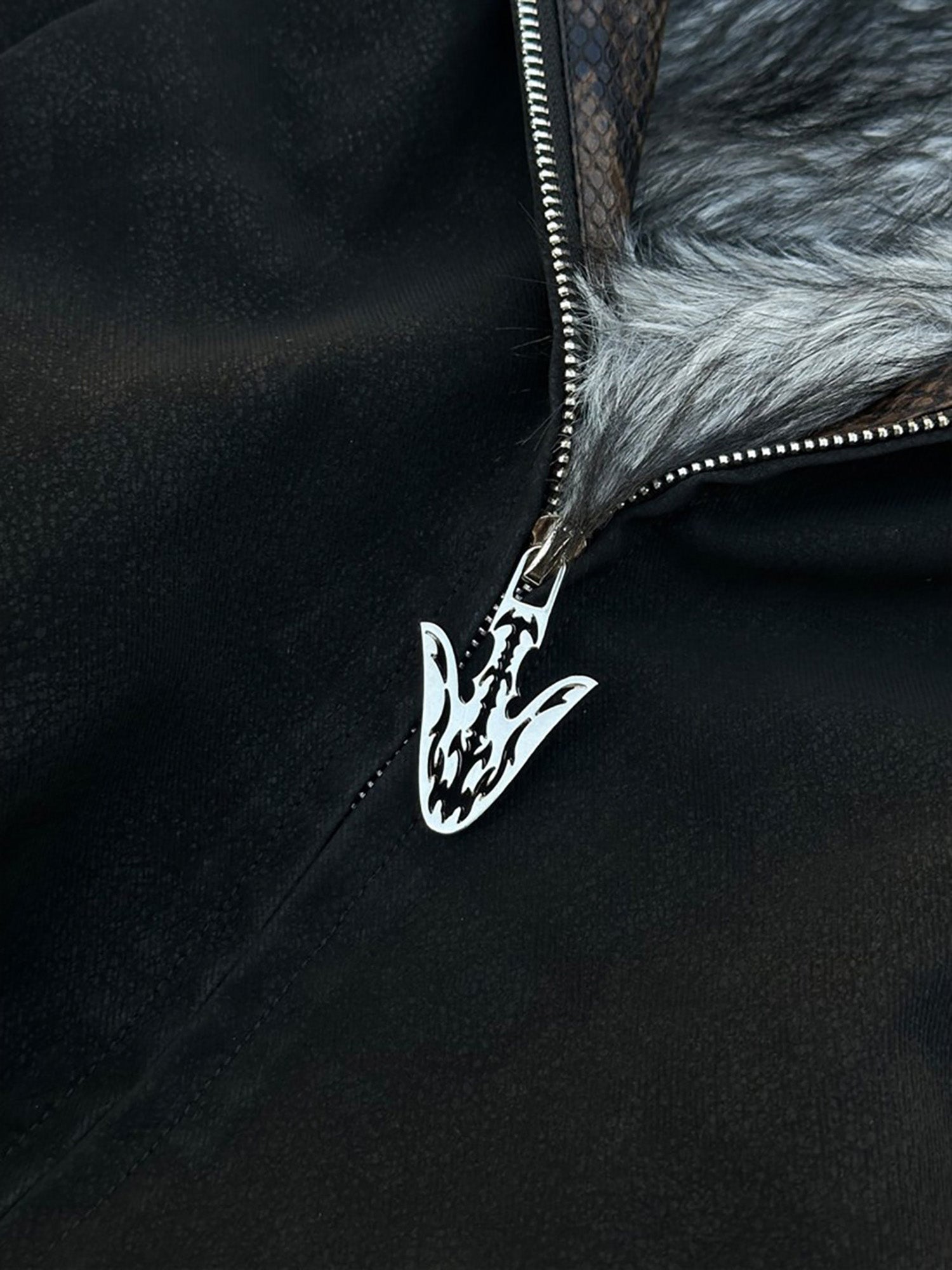 Trotzen Sie der Kälte mit einer imposanten Mischung aus Luxus und Aggressivität. Das weiche Fellfutter im Inneren schafft eine wohlige Wärmeoase, während die dornenbesetzte Stickerei andere warnt, Abstand zu halten.